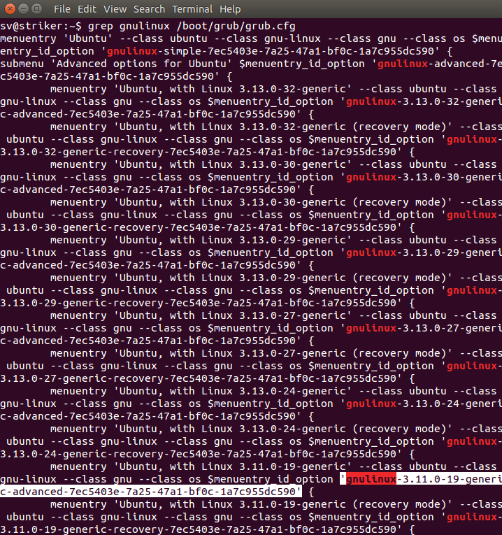 2.) Next, we get the $menuentry_id_option for the 3.11.0-19-generic kernel boot entry that we know will work with my friend's computer and we highlight the id for it. Hit CTRL+ALT+t to open a terminal and run: